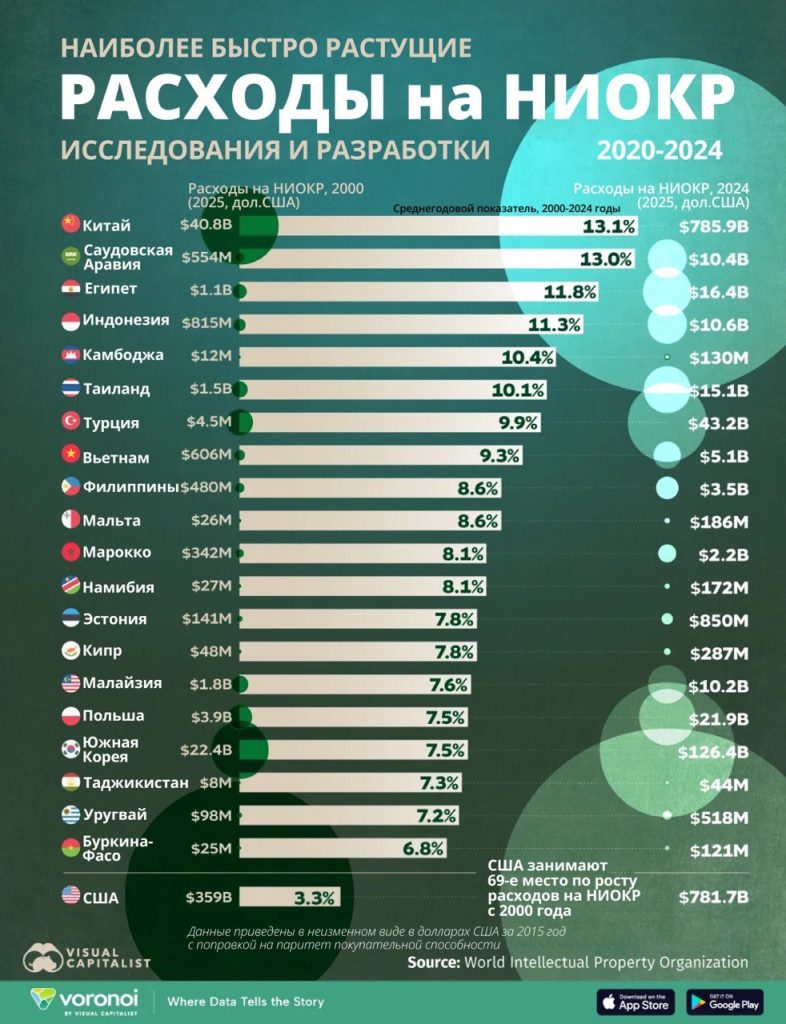 Представленная иллюстрация ранжирует страны мира с наиболее быстрорастущими расходами на НИОКР на основе показателя среднегодового темпа роста (CAGR) валовых расходов на НИОКР в период с 2000 по 2024 год, используя данные Всемирной организации интеллектуальной собственности (WIPO). Все цифры указаны в долларах США с поправкой на паритет покупательной способности (PPP) 2015 года.