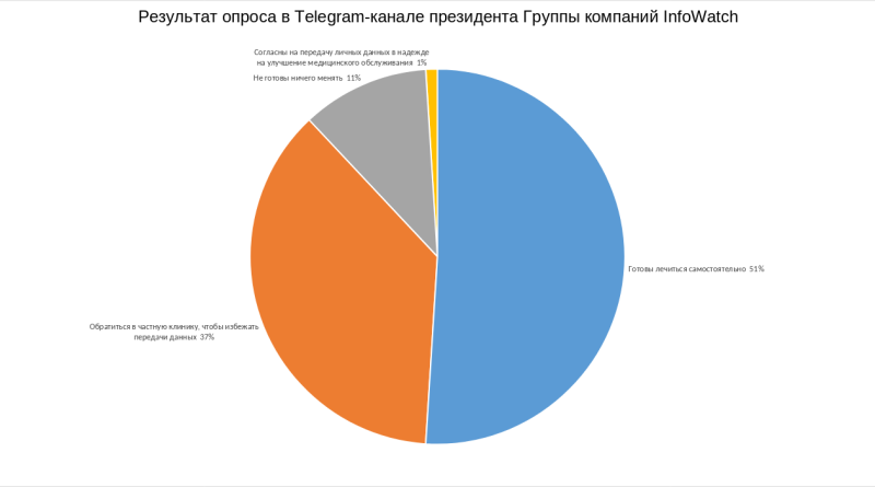 Более половины (51%) из 10,7 тысячи опрошенных в Telegram-канале президента Группы компаний InfoWatch, эксперта в области информационной безопасности Натальи Касперской сообщили о готовности лечиться самостоятельно, лишь бы избежать передачи данных о своём заболевании в единый федеральный регистр пациентов.